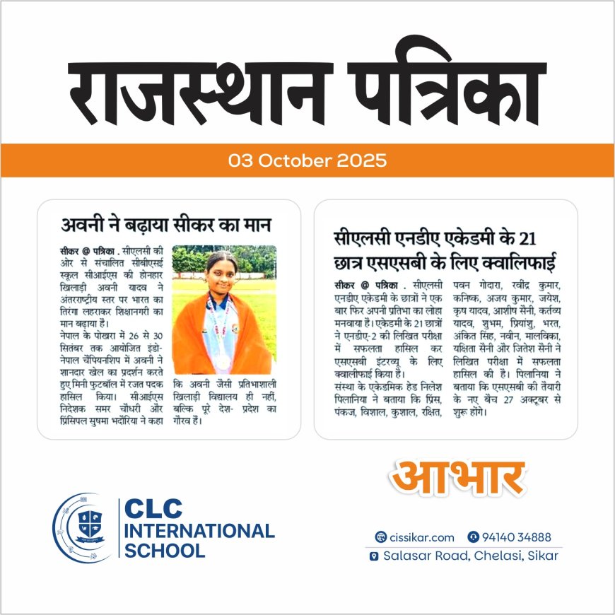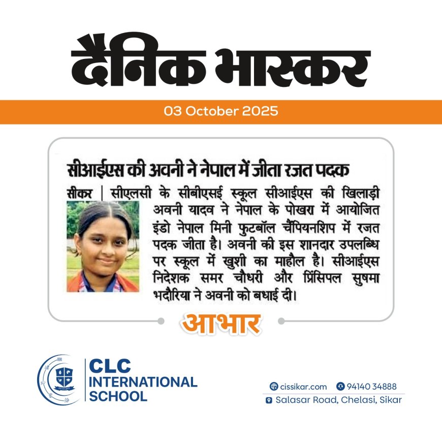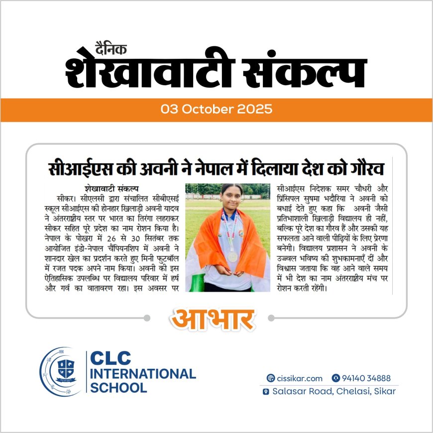 सीकर। सीएलसी द्वारा संचालित सीबीएसई स्कूल सीआईएस की होनहार खिलाड़ी अवनी यादव ने अंतरराष्ट्रीय स्तर पर भारत का तिरंगा लहराकर सीकर सहित पूरे प्रदेश का नाम रोशन किया है। नेपाल के पोखरा में 26 से 30 सितंबर तक आयोजित इंडो-नेपाल चैंपियनशिप में अवनी ने शानदार खेल का प्रदर्शन करते हुए मिनी फुटबॉल में रजत पदक अपने नाम किया।
