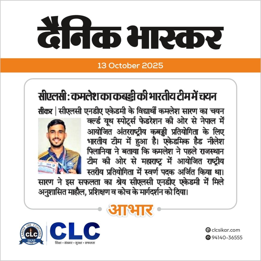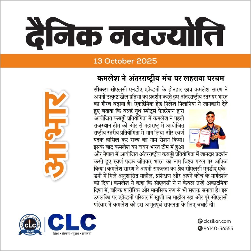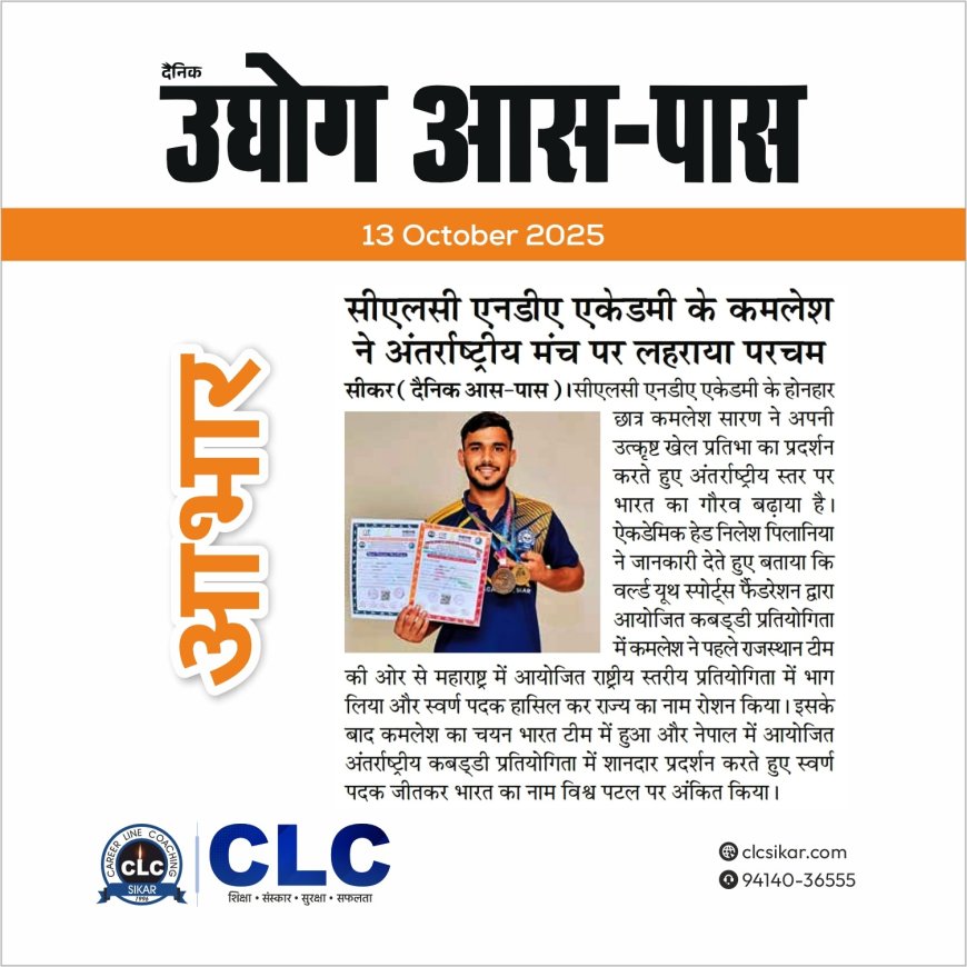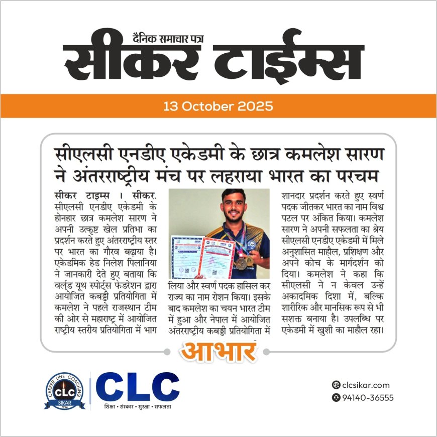 कमलेश सारण ने अपनी सफलता का श्रेय सीएलसी एनडीए एकेडमी में मिले अनुशासित माहौल, प्रशिक्षण और अपने कोच के मार्गदर्शन को दिया। कमलेश ने कहा कि सीएलसी ने न केवल उन्हें अकादमिक दिशा में, बल्कि शारीरिक और मानसिक रूप से भी सशक्त बनाया है। इस उपलब्धि पर एकेडमी परिवार में खुशी का माहौल रहा और पूरे सीएलसी परिवार ने कमलेश को इस अभूतपूर्व सफलता के लिए बधाई दी और उज्जवल भविष्य की कामना की।