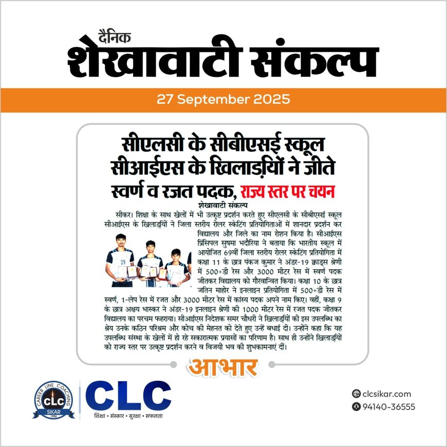 सीकर। शिक्षा के साथ खेलों में भी उत्कृष्ट प्रदर्शन करते हुए सीएलसी के सीबीएसई स्कूल सीआईएस के खिलाड़ियों ने जिला स्तरीय रोलर स्केटिंग प्रतियोगिताओं में शानदार प्रदर्शन कर विद्यालय और जिले का नाम रोशन किया है।